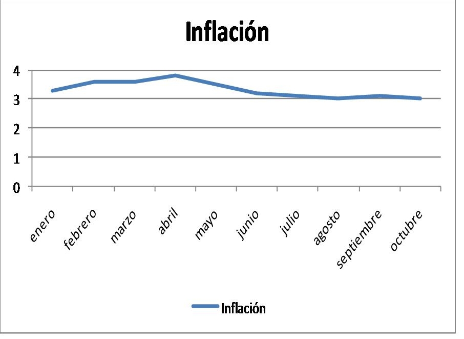 Si analizamos el siguiente gráfico, realizado a partir de los datos ofrecidos con carácter mensual por el Instituto Nacional de Estadística, observamos como la inflación durante este año 2011 ha seguido una tendencia más o menos estable, superando en todo momento el 3%, en tasa interanual.