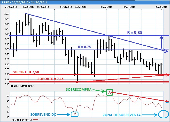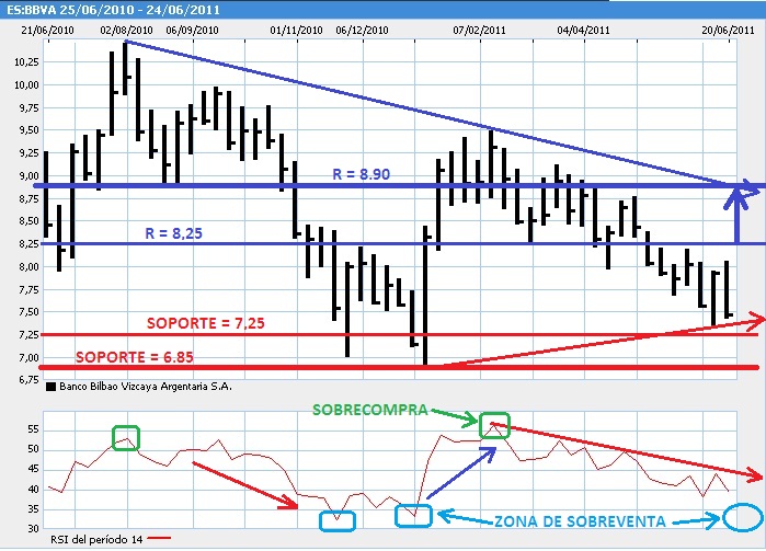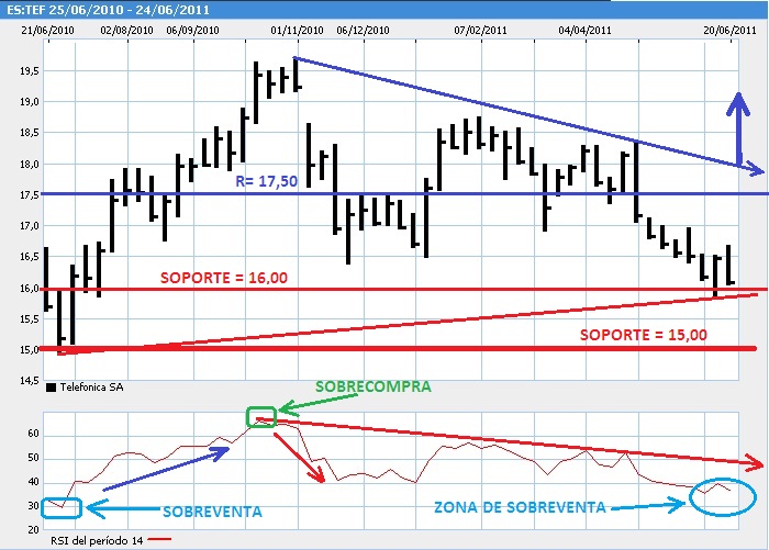 Debemos empezar nuestro análisis del mercado español viendo como se encuentran el índice de referencia Ibex35 y los valores Telefónica, Santander y BBVA, para ello debemos recordar a nuestros “pequeños y medianos inversores” que Telefónica supone una ponderación de 20,29%, Santander un 17,50% y BBVA el 9,40% del peso total por capitalización del Ibex35 a fecha 24/06/2011.