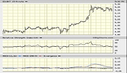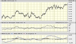 SANTANDER– 5 DÍAS – El gráfico nos presenta la evolución desde la cota 5,60€ donde ha hecho doble suelo esta semana, para posteriormente iniciar un fuerte impulso que le acercó a los 6,00€ y finalizar el viernes en 5,912€. El volumen está aumentando y es posible que una vez superados los 6,00€ se dirija hacia la fuerte resistencia situada en los 6,50€.
