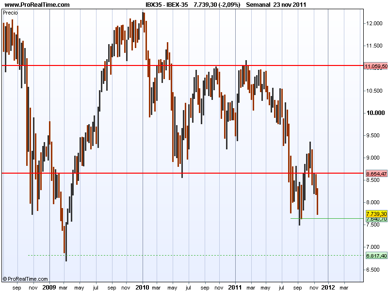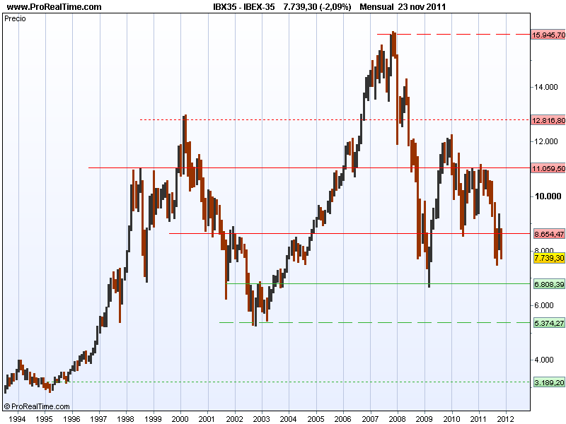 Nuestra línea verde discontinúa del segundo gráfico ha pasado ha ser la verde continua de este gráfico mensual del IBEX 35 con la evolución desde 1994 hasta 2011. En el mismo podemos ver que después sólo nos queda el soporte del año 2002 en unos 5.370 puntos para volver a niveles de los 90.