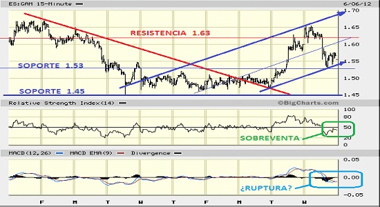 - Que la consolidación del soporte situado en los 1,45€ sea el origen de una progresiva recuperación de los precios en las acciones de la empresa que deberá recuperar cotas superiores de forma moderada, apoyada por el conjunto del mercado y sobre todo dicha subida, tiene que estar “arropada” por un aumento del volumen diario que manifieste la nueva entrada de dinero en el valor.