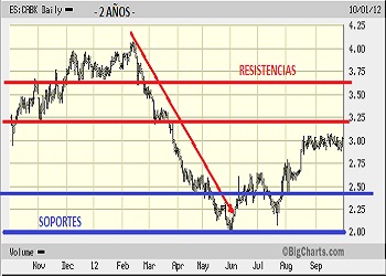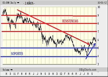 - Medio plazo: Para este periodo primero deberá superar los 3,50€ y dirigirse a la fuerte resistencia situada en los 4,00€ de principio de año, donde de consolidar niveles, podría intentar “asaltar” las cotas de 4,50€ e incluso los 5,00€, que se antojan…tan lejanos. (Cierre 01/10/2012).